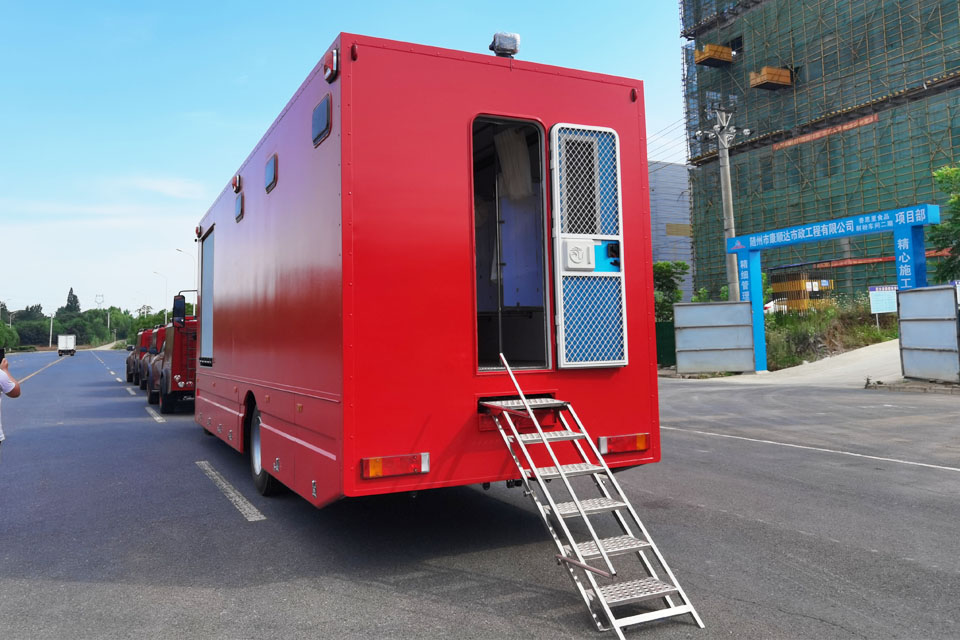 1、整車擴展艙為更衣間,更衣間右外側設有門和門梯,撤收后門梯固定在主車廂下副梁中間,更衣間門口處設有門梯燈;廂體后端設有登頂梯,主車廂下設有擴展機構,擴展艙(更衣間)的展開和撤收由擴展機構實現,撤收后有可靠的鎖緊機構。設備間在廂體前端:內部有燃油熱水鍋爐、2.8KVA柴油發電機、水泵、精密過濾器、暖風機、滅火器、通風窗、照明燈;淋浴間設置12個淋浴噴頭、U形不銹鋼水箱(淋浴間前端、右端、后端設置水箱)、皂盒、通風窗、照明燈;更衣間為右側擴展艙,內設有更衣柜、衣帽鉤、照明燈、前端下部設有通風進氣門、后端上部設有換氣扇。