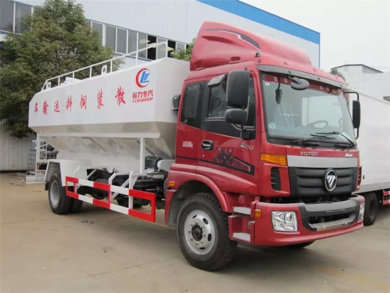 液壓式散裝飼料運輸車的飼料罐架設在卡車的底盤上,專用設施由罐體總成、輸送系統(水平卸料系統、垂直卸料系統以及活動卸料系統組成)、液壓系統(高壓油泵經管路與分配閥連接該閥的三個輸出端分別是轉角液壓馬達、升降油缸以及串聯在一起的水平卸料、垂直卸料、活動卸料液壓馬達)、電動系統、氣動分倉機構等組成。在罐體底部設有閘門,在閘門下面裝有水平螺旋輸送器(俗稱水平攪籠),由取力器由汽車變速箱輸出動力驅動,再傳動高壓油泵以驅動液壓系統,液壓馬達通過傳動裝置帶動水平螺旋輸送器的葉片軸及葉片旋轉, 經活動輸送系統(俗稱活動攪籠)以將飼料輸出。車頂平置的一根活動卸料絞龍可自由回轉和抬升,運輸時,頂部的螺旋管平臥在罐頂;卸料時則抬起,使管端的出料口與畜禽飼養場貯料罐頂部的進料門相接、對準,完成卸料。