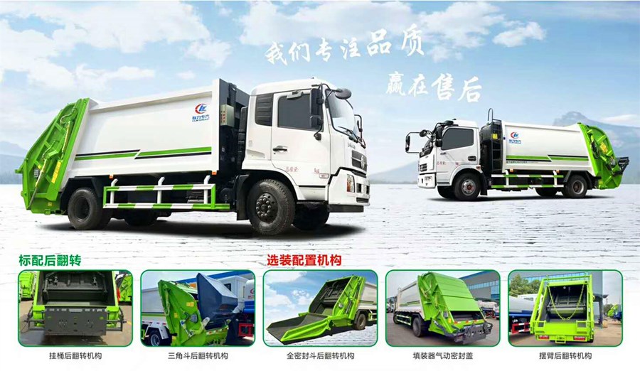 | 其它 | 1、3950和4500兩種軸距。2、選裝翻轉:三角斗,掛桶裝置,擺臂裝置,大落地斗裝置。自帶abs,行車記錄儀 | ||